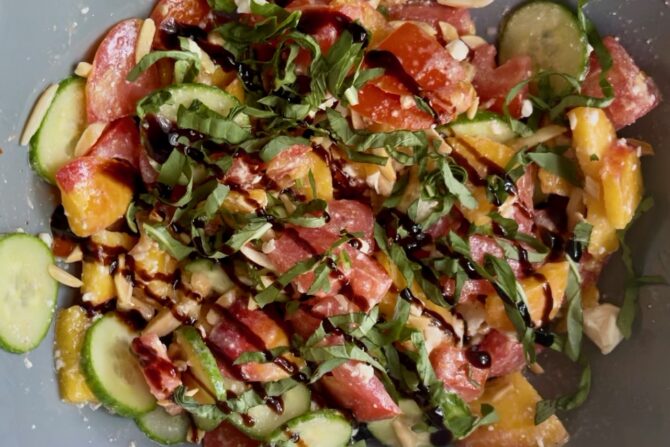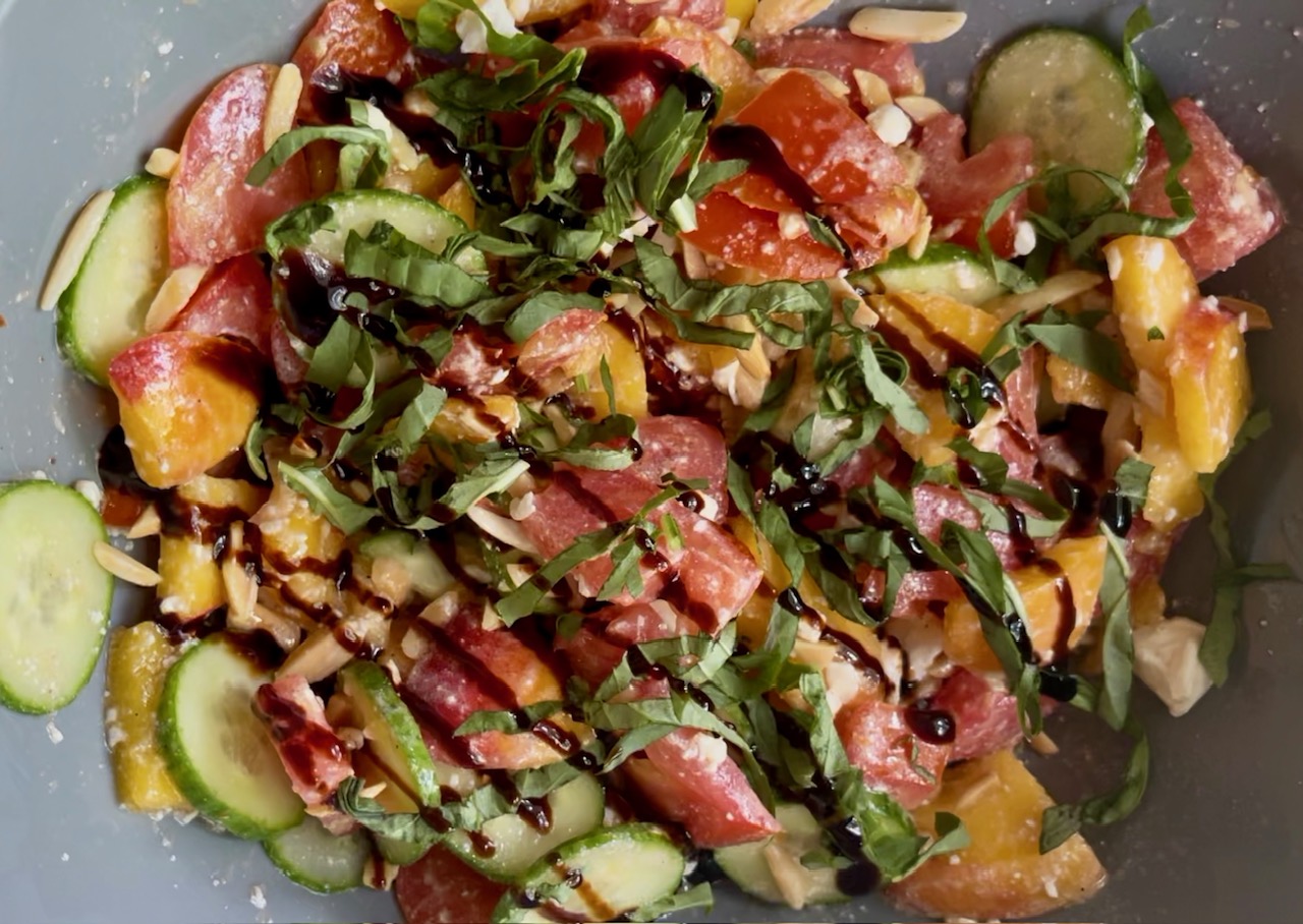 Cut the tomato, peaches, and cucumber into bite-sized pieces. Add to a large bowl and toss with feta, almonds, olive oil, salt and pepper. Top with the basil and drizzle balsamic glaze on top. Add additional feta or almonds as desired.